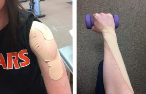 In the physical therapy setting, kinesiology tape is used to assist in the treatment of many different injuries. I use it frequently on shoulders, wrists/elbows, knees, and ankles with great success. My ultimate goal is also to teach the client or family member to tape themselves. This helps them to learn to manage their pain or symptoms on their own.