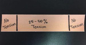 1) There should never be tension or pull on approximately one inch of either end of the tape strip when applied. All the tension is in the middle of the strip and typically the less tension (25%-50% of the maximum stretch) the better.