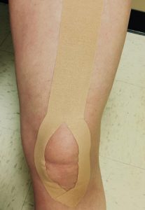 2) To assist or facilitate a weak muscle, taping is done from origin (where the muscle begins) to insertion (where the muscle attaches). This is where knowledge of human anatomy comes in, or maybe Google. 🙂 For example, pain in the front of the knee may be worsened by weakness of the quadriceps muscle group. The quads originate from the groin area and insert below the patella (knee cap). So a quadriceps taping might look like the below. It would be used to assist with treating knee pain or weakness after injury or surgery. I typically splint the tape into a “Y” to go around the knee cap rather than over.